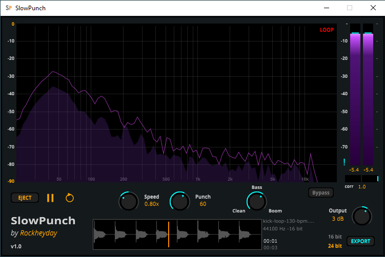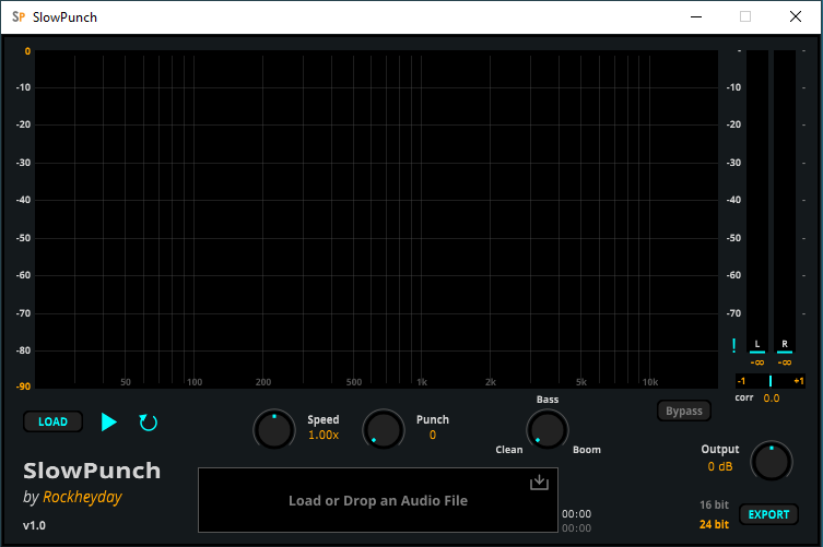 Beyond these sonic transformations, SlowPunch features high-resolution visual feedback including a real-time dual-layer spectrum analyzer (Dry/Wet FFT), allowing you to see the effect of Punch and Bass in real time. With easy drag-and-drop loading and WAV export, SlowPunch is designed for quick, fun, and impactful sound shaping, perfect for deep exploration and refinement of your audio.