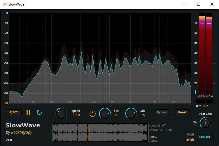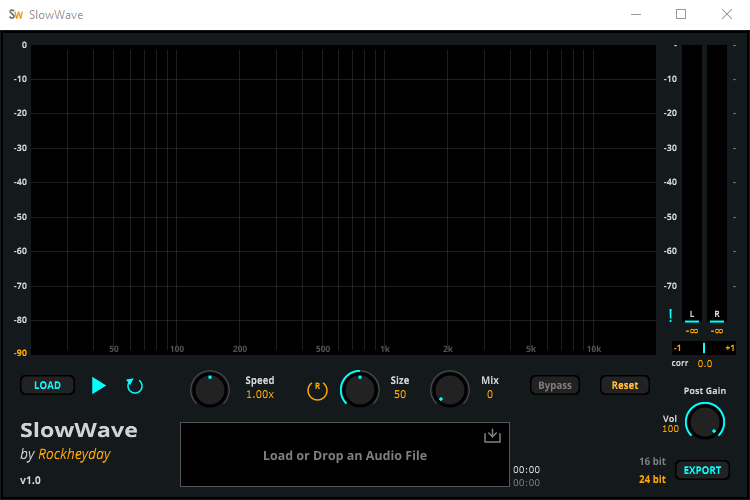 SlowWave is a creative slow-playback and reverb transformation tool that lets you stretch audio between 0.5x and 1.5x while shaping ambience with size and mix controls. It includes LR peak meters, stereo correlation, and dual-layer FFT for detailed visual feedback.