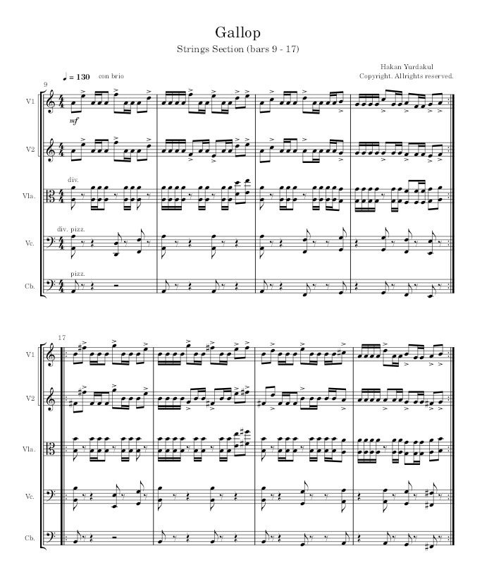 I often use this technique to bring energy to my musical works. “Gallop” is one such track, featured in the EP Life as a Routine. Below, I’m sharing an excerpt that visually presents only the strings section, while the audio plays the full orchestral segment. The complete audio track is included afterward.